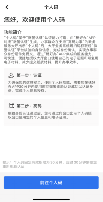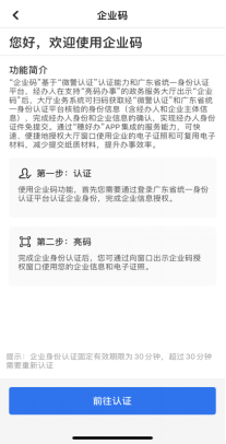 第三步:申请人根据办理事项,选择使用场景“个人码”或“企业码”,“刷脸”进行身份认证后,向不动产登记机构展示“个人码/企业码”。(注:使用企业码功能,首先办事人需通过“微警认证”进行实人刷脸,再使用企业账户通过“粤信签”小程序进行企业法人身份验证,认证成功后才进行亮码操作。)