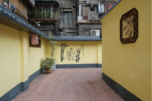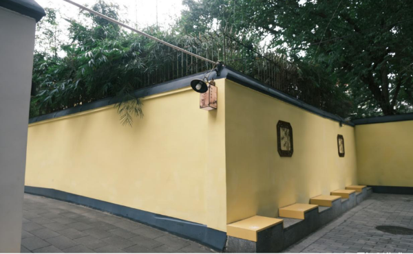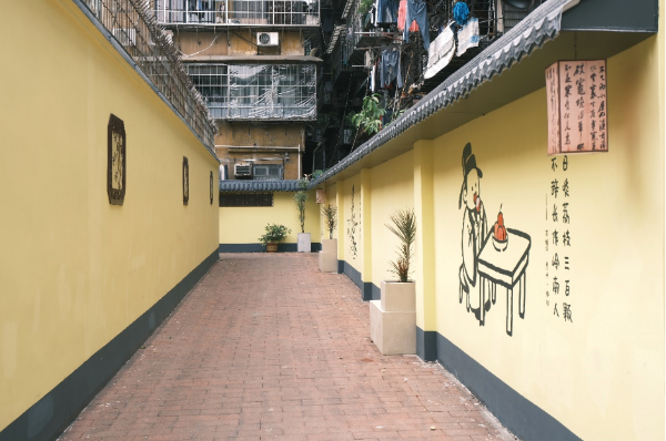 本次胜雨径提升亮点在于围墙改造,市城规公司设计团队以苏轼豁达的人生观为主题,将其自黄州、儋州到广州所作的诗句生成对应场景,通过简笔彩绘方式融入巷墙的设计中。每处转角对应一处场景,或是美食佳肴、或是人生感慨,让巷子成为可读、可感、可悟的文化长廊。墙顶覆以树脂瓦,墙身饰以黄漆,并嵌岭南特色窗花,于古寺意境中融入当代设计语言。