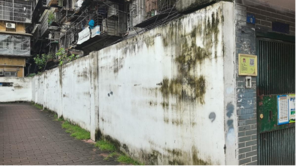 改造前围墙脏污,地面杂草丛生