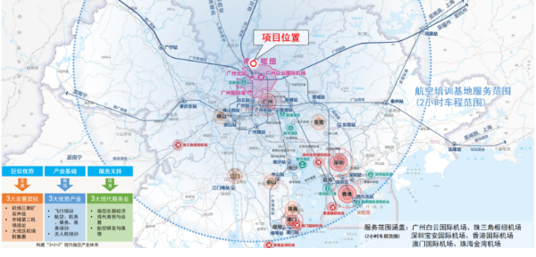 广州作为中国南方核心交通枢纽,正通过航空、航运、铁路及城市轨道的全方位建设,着力打造连接全球、辐射全国的枢纽。项目位于“空铁联运”规划核心圈层,结合白云机场三期扩建工程,加快航空培训产业布局建设,完善航空产业链条,构建“3+3+3”现代临空产业体系。