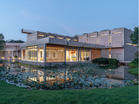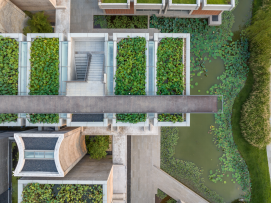 建筑屋面设置了近三十组不同尺寸的种植池,其中,种植于此的水生植物不仅是充满野趣的景观,更能降低建筑能耗。一条架空步道穿梭于屋面,从这里望去,种植池与下沉式庭院、周边的天然荷塘相互呼应,使春阳台成为一座融入环境、高低错落的“立体荷塘”。