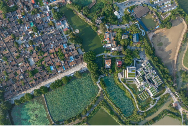 在统筹古村整体活化利用时,充分重视设计对挖掘乡村历史魅力的作用,优先考虑建筑与自然的和谐共处。在塱头村,村头的大榕树是村民们心中的“乡愁”。在“春阳台”的设计之初,主创设计师就特别思考过建筑和大榕树的关系,希望大榕树能比房子大以更好适应古村尺度,建筑主体下沉至地下一层,屋顶种植25组生态荷塘,与村前荷塘共同构成“立体荷塘”景观。“春阳台”的较小的建筑尺度,代表着大城市里很难体会到的亲近。尊重自然,“春阳台”依荷塘而建,以更好融入生态环境,营造更宜居宜游的生活场景。