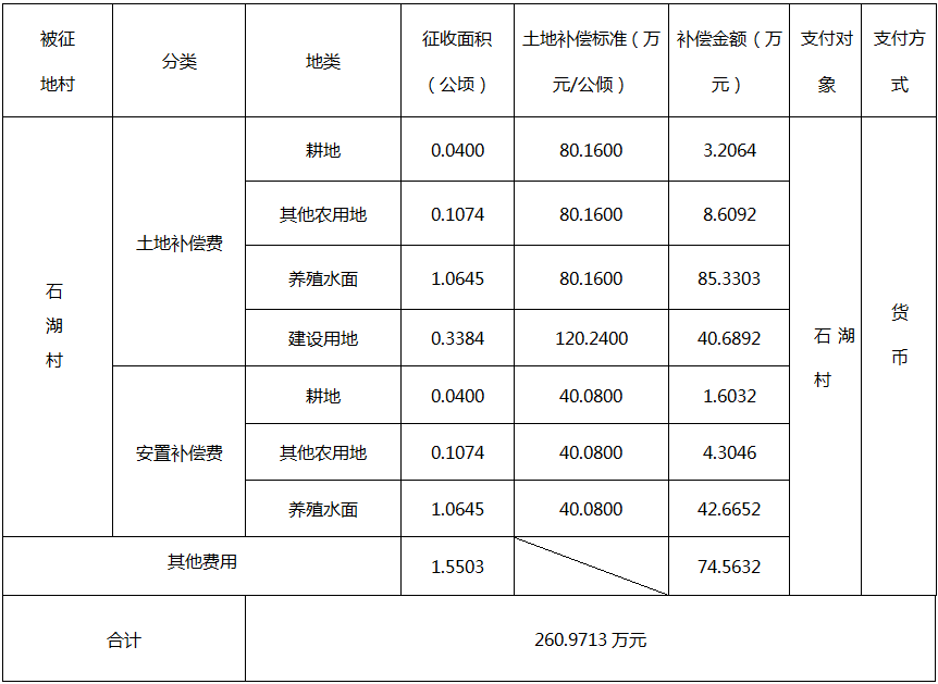 花都区炭步镇石湖村集体土地合计1.5503公顷(合23.2545亩),其中耕地0.04公顷(合0.6亩)、其他农用地0.1074公顷(合1.611亩)、养殖水面1.0645公顷(合15.9675亩)、建设用地0.3384公顷(合5.076亩);