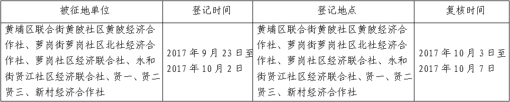 (二)本次征收土地所涉及的被安置农业人员由黄埔区联合街黄陂社区黄陂经济合作社、萝岗街萝岗社区北社经济合作社、萝岗社区经济联合社、永和街贤江社区经济联合社、贤一、贤二、贤三、新村经济合作社以货币补偿的形式安置。请黄埔区联合街黄陂社区黄陂经济合作社、萝岗街萝岗社区北社经济合作社、萝岗社区经济联合社、永和街贤江社区经济联合社、贤一、贤二、贤三、新村经济合作社在本公告期内到广州开发区广州市黄埔区国土资源和规划局领取办理安置农业人口征地农转非手续的函件。
