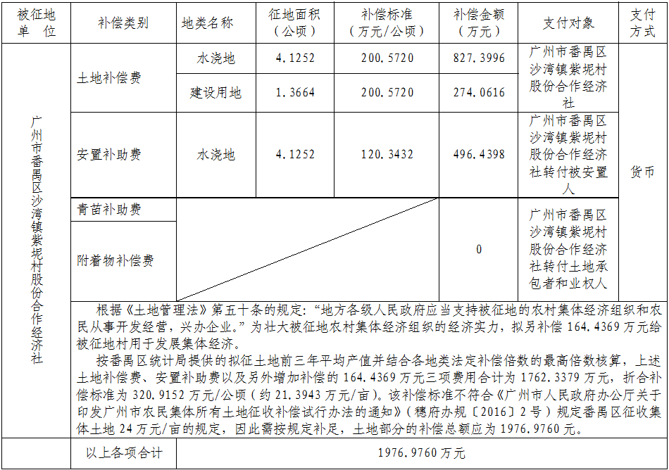 三、被征地村及面积:广州市番禺区沙湾镇紫坭村股份合作经济社,集体土地5.4916公顷(折合约82.3740亩),其中耕地4.1252公顷(折合约61.8780亩),建设用地1.3664公顷(合20.4960亩)。