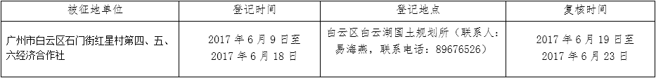 经广州市人民政府同意并经广东省人民政府批准(粤国土资(建)字〔2017〕223号)同意将白云区石门街红星村属下的集体土地征收为国有土地。现将经依法批准的《征收土地方案》、市人民政府批准的《征地补偿安置方案》内容和有关事项公告如下: