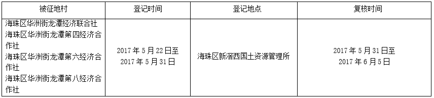 经省人民政府批准(粤国土资(建)字〔2017〕107号文),需将广州市海珠区华洲街龙潭经济联合社及海珠区华洲街龙潭第四、第六、第八经济合作社4.9276公顷(合73.9140亩)集体土地征收为国有土地。现将经依法批准的《征收土地方案》、市人民政府批准的《征地补偿安置方案》内容和有关事项公告如下: