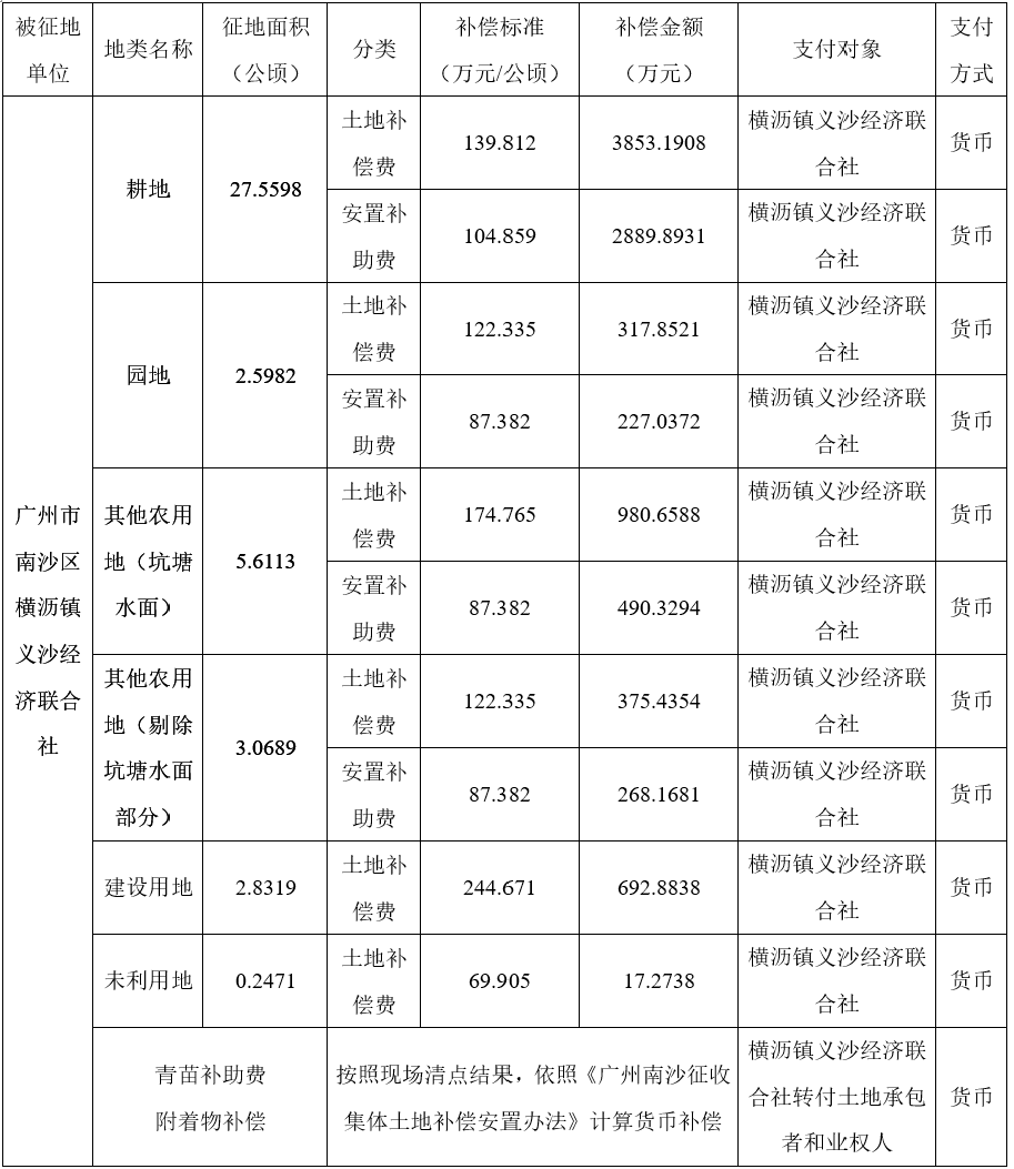 经省人民政府批准(粤国土资(建)字〔2016〕436号文),需将南沙区横沥镇义沙、长沙经济联合社44.1036公顷(合661.554亩)集体土地征收为国有土地。现将经依法批准的《征收土地方案》、市人民政府批准的《征地补偿安置方案》内容和有关事项公告如下:
