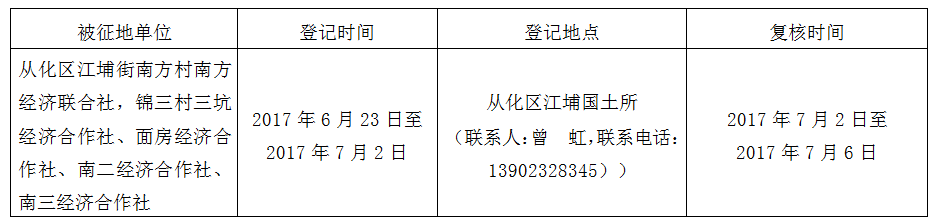 经广州市人民政府同意并经广东省人民政府批准(粤国土资(建)字〔2017〕247号)同意将广州市从化区江埔街南方村、锦三村地段5.9890公顷集体土地征收为国有土地。现将经依法批准的《征收土地方案》、市人民政府批准的《征地补偿安置方案》内容和有关事项公告如下: