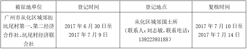 经广州市人民政府同意并经广东省人民政府批准(粤国土资(建)字〔2017〕17号)同意将广州市从化区城郊街坑尾村2.8307公顷集体土地征收为国有土地。现将经依法批准的《征收土地方案》、市人民政府批准的《征地补偿安置方案》内容和有关事项公告如下: