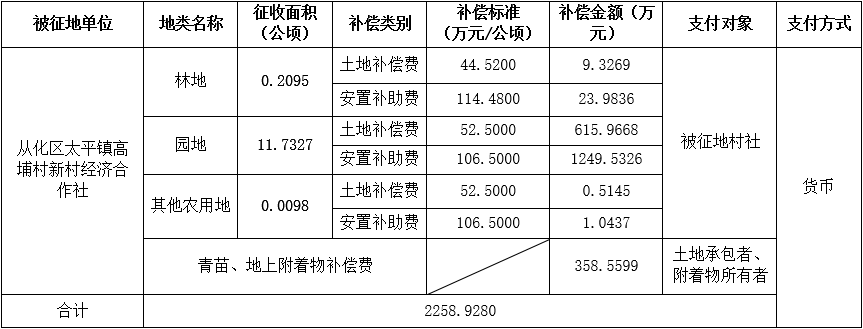 (二)本次征收土地所涉及的被安置农业人员由广州市从化区太平镇高埔村新村经济合作社以货币补偿等形式安置。