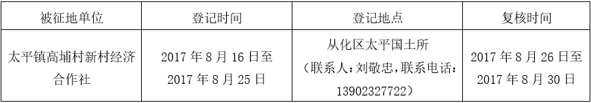经广州市人民政府同意并经广东省人民政府批准(粤国土资建字(2017)326号)同意将广州市从化区太平镇高埔村地段11.9520公顷集体土地征收为国有土地。现将经依法批准的《征收土地方案》、市人民政府批准的《征地补偿安置方案》内容和有关事项公告如下: