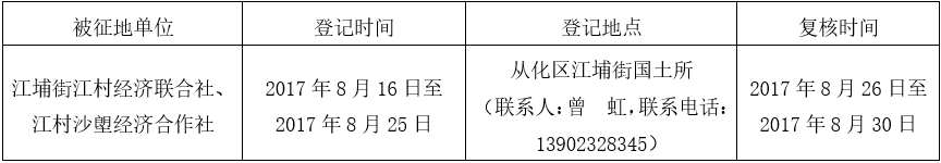 经广州市人民政府同意并经广东省人民政府批准(粤国土资建字(2017)326号)同意将广州市从化区江埔街江村地段6.8154公顷集体土地征收为国有土地。现将经依法批准的《征收土地方案》、市人民政府批准的《征地补偿安置方案》内容和有关事项公告如下: