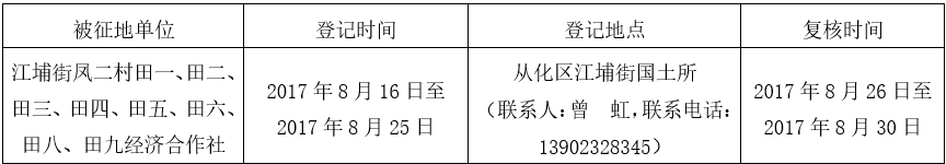 经广州市人民政府同意并经广东省人民政府批准(粤国土资建字(2017)326号)同意将广州市从化区江埔街凤二村地段0.3336公顷集体土地征收为国有土地。现将经依法批准的《征收土地方案》、市人民政府批准的《征地补偿安置方案》内容和有关事项公告如下: