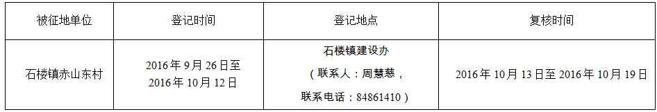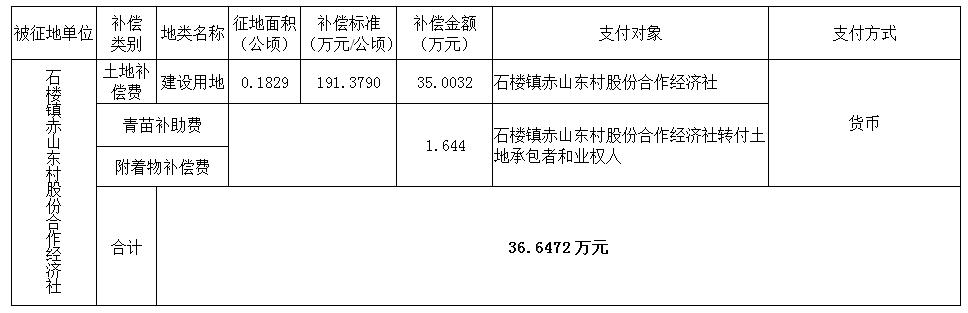 三、被征地村及面积:石楼镇赤山东村集体土地0.1829公顷(合2.7435亩),其中集体建设用地0.1829公顷(合2.7435亩)。