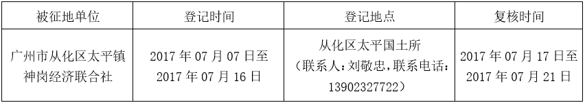 经广州市人民政府同意并经广东省人民政府批准(粤国土资(建)字〔2016〕164号)同意将广州市从化区太平镇神岗村地段1.9715公顷集体土地征收为国有土地。现将经依法批准的《征收土地方案》、市人民政府批准的《征地补偿安置方案》内容和有关事项公告如下: