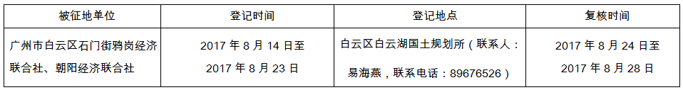 经广州市人民政府同意并经广东省人民政府批准(粤国土资(建)字〔2017〕423号)同意将白云区石门街鸦岗经济联合社、朝阳经济联合社属下的集体土地征收为国有土地。现将经依法批准的《征收土地方案》、市人民政府批准的《征地补偿安置方案》内容和有关事项公告如下: