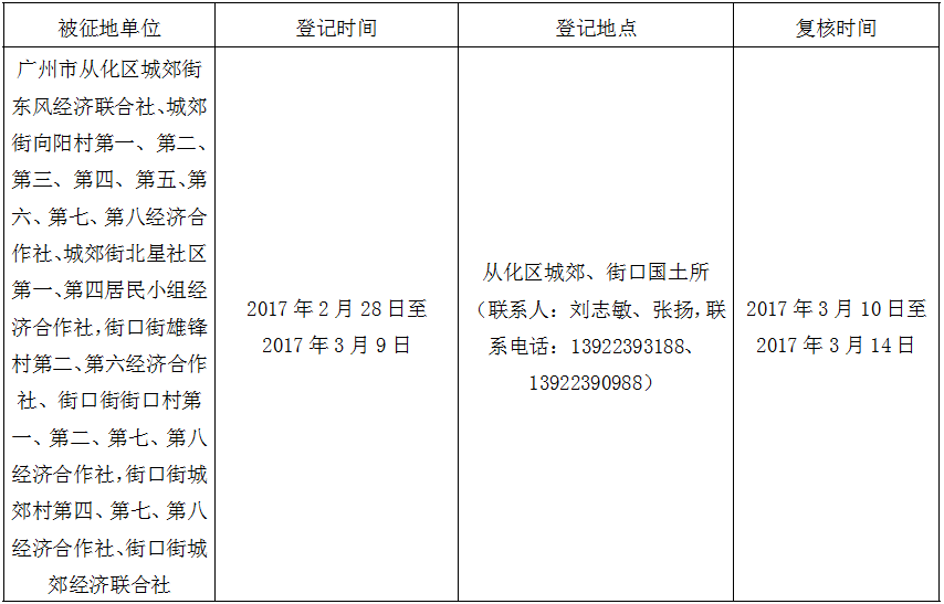 经广州市人民政府同意并经广东省人民政府批准(粤国土资(建)字〔2016〕639号)同意将广州市从化区城郊街东风村、向阳村、北星社区,街口街街口村、城郊村、雄锋村地段8.3394公顷集体土地征收为国有土地。现将经依法批准的《征收土地方案》、市人民政府批准的《征地补偿安置方案》内容和有关事项公告如下: