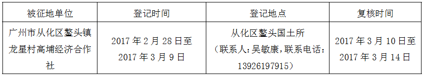 经广州市人民政府同意并经广东省人民政府批准(粤国土资(建)字〔2017〕16号)同意将广州市从化区鳌头镇龙星村地段0.4949公顷集体土地征收为国有土地。现将经依法批准的《征收土地方案》、市人民政府批准的《征地补偿安置方案》内容和有关事项公告如下: