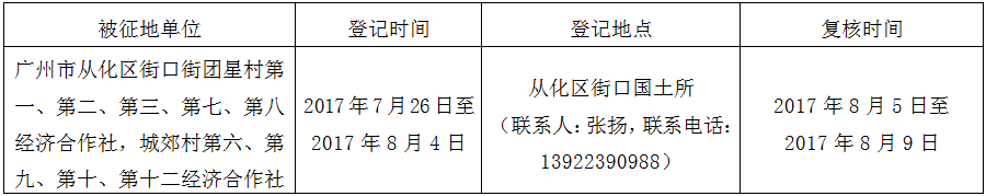 经广州市人民政府同意并经广东省人民政府批准(粤国土资(建)字〔2015〕1359号)同意将广州市从化区街口街团星村第一、第二、第三、第七、第八经济合作社和街口街城郊村第六、第九、第十、第十二经济合作社共13.8987公顷集体土地征收为国有土地。现将经依法批准的《征收土地方案》、市人民政府批准的《征地补偿安置方案》内容和有关事项公告如下: