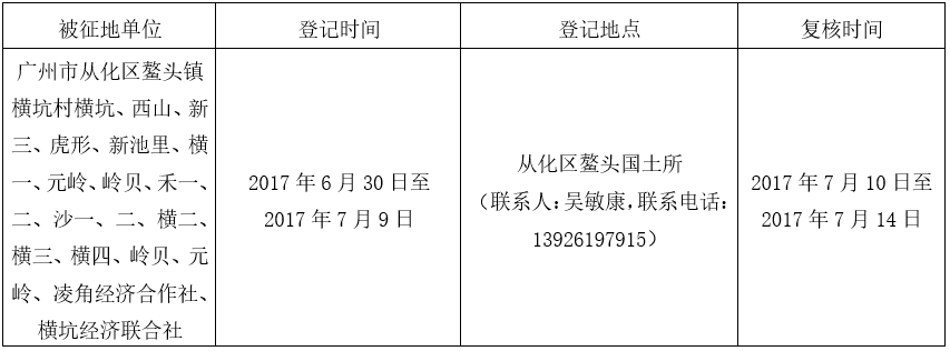 经广州市人民政府同意并经广东省人民政府批准(粤国土资(建)字〔2016〕636号)同意将广州市从化区鳌头镇横坑村地段53.7226公顷集体土地征收为国有土地。现将经依法批准的《征收土地方案》、市人民政府批准的《征地补偿安置方案》内容和有关事项公告如下: