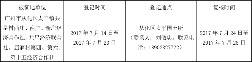 经广州市人民政府同意并经广东省人民政府批准(粤国土资(建)字〔2016〕674号)同意将广州市从化区太平镇共星村、屈洞村地段4.3558公顷集体土地征收为国有土地。现将经依法批准的《征收土地方案》、市人民政府批准的《征地补偿安置方案》内容和有关事项公告如下: