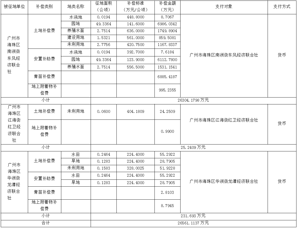 (二)本次征收土地所涉及的被安置农业人员由广州市海珠区南洲街东风经济联合社、江海街红卫经济联合社、华洲街龙潭经济联合社以货币补偿的形式安置。