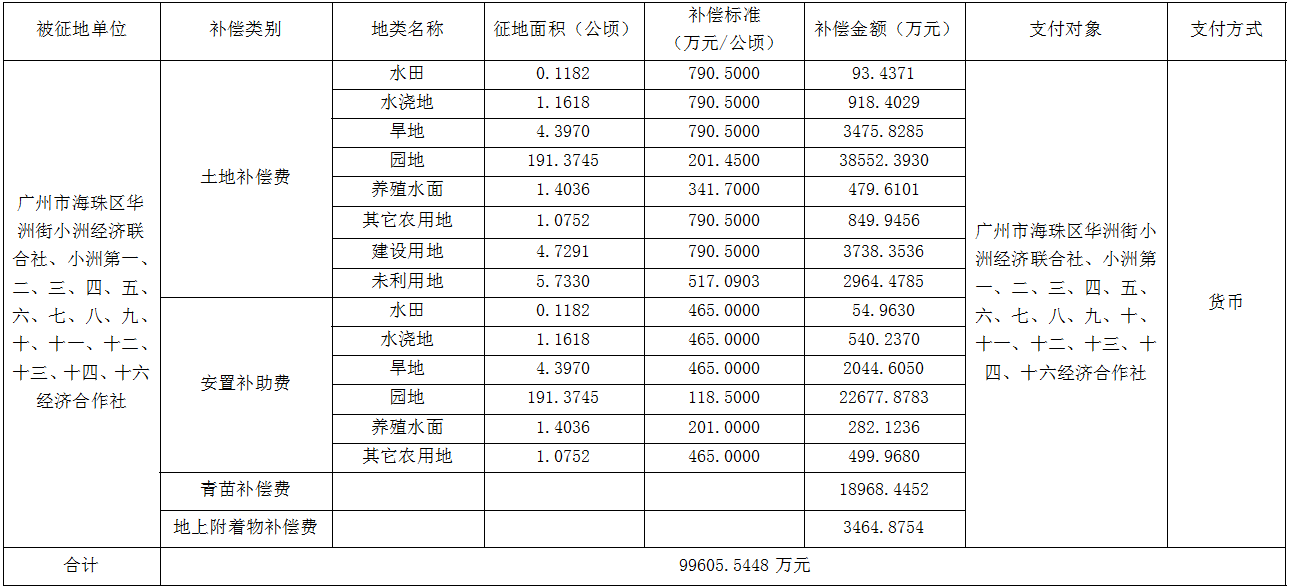 三、被征地村社及面积:广州市海珠区华洲街小洲经济联合社、小洲第一、二、三、四、五、六、七、八、九、十、十一、十二、十三、十四、十六经济合作社,集体农用地199.5303公顷、集体建设用地4.7291公顷、集体未利用地5.7330公顷,合计209.9924公顷(合3149.886亩)。