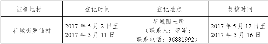 经省人民政府批准(粤国土资(建)字〔2016〕281号文),需将广州市花都区花城街罗仙村属下的集体土地9.0956公顷(合136.43亩)征收为国有土地。现将经依法批准的《征收土地方案》和市人民政府批准的《征地补偿安置方案》内容和有关事项公告如下: