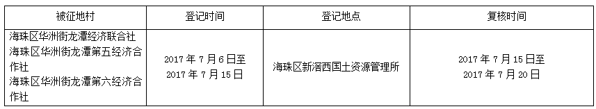 经省人民政府批准(粤国土资(建)字〔2017〕351号文),需将广州市海珠区华洲街龙潭经济联合社及海珠区华洲街龙潭第五、第六经济合作社1.6391公顷(合24.5865亩)集体土地征收为国有土地。现将经依法批准的《征收土地方案》、市人民政府批准的《征地补偿安置方案》内容和有关事项公告如下: