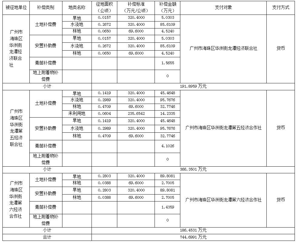 三、被征地村社及面积:广州市海珠区华洲街龙潭经济联合社集体农用地0.3479公顷(合5.2185亩),广州市海珠区华洲街龙潭第五经济合作社集体农用地0.9117公顷、未利用地0.0604公顷(合14.5815亩),广州市海珠区华洲街龙潭第六经济合作社集体农用地0.3191公顷(合4.7865亩)。