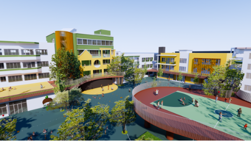 构建连廊系统串联多维活动空间。为解决园区内儿童的学习生活和日常休闲娱乐的需求,项目沿建筑内侧设置连廊系统,风雨连廊把本分散的区域串联在一起,贯通园区各栋建筑,增强了各区域间的流动性和连接性,多维度升级了活动空间,也让师生行走路线大幅缩短,大大提高了通行效率。