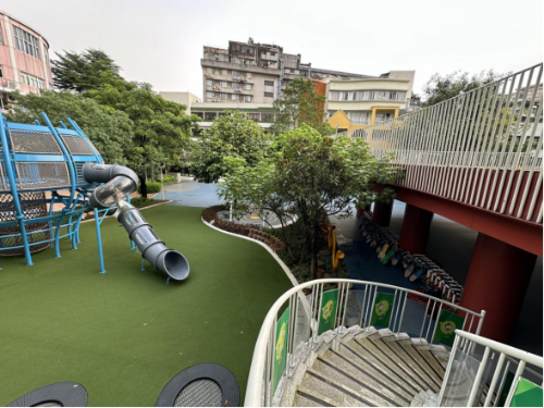 立体复合空间满足多样使用需求。活动场地存在多处高差,高差间联系较弱,北组团两个二层活动平台较为孤立,缺乏系统结构性的统一规划。冼剑雄设计师团队重新梳理校园分区结构,结合校园现状及未来使用需要,结合一层活动空间与二层活动平台,打造立体复合、灵活多样的组合式游乐场。