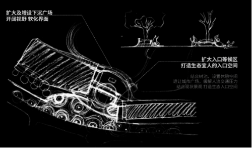 入口改造提升激活节点空间。对入口形象进行提升改造,同时激活二层活动平台,增加趣味性节点,与建筑形成整体空间,营造阳光活泼儿童喜爱的活动场所。