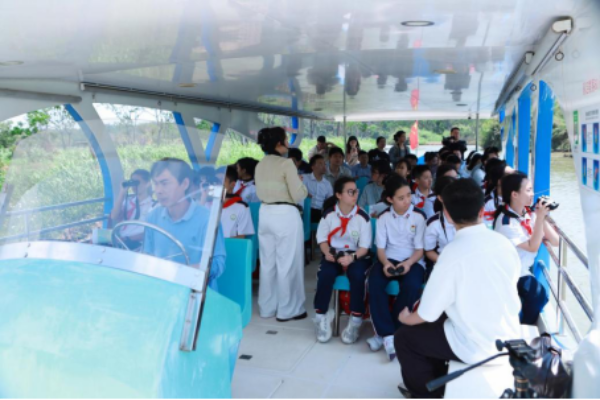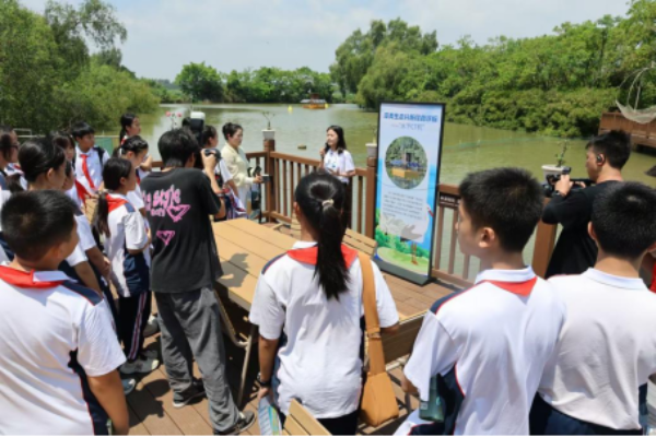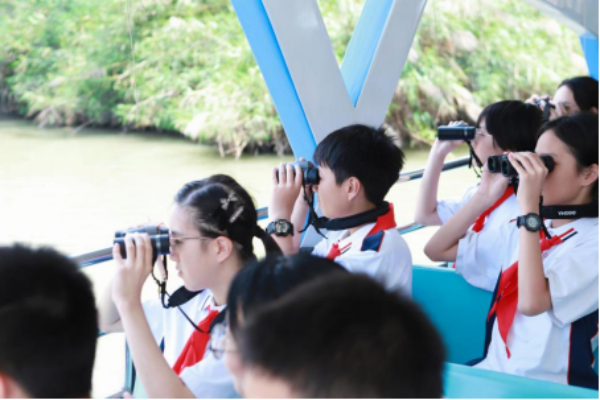 在湿地研学导师的带领下,师生们手持望远镜和图鉴,沿观鸟长廊开启了一场“鸟类发现之旅”。白鹭、苍鹭和黑脸琵鹭等湿地精灵的身影频频现身。“原来南沙湿地是候鸟迁徙的‘国际机场’!”一位学生兴奋表示。