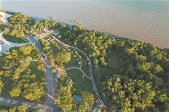近年来,广州深入实施海洋生态修复工程。2022年完成番禺区海鸥岛红树林海岸升级改造与生态修复项目,修复海岸线3.91千米,营造红树林6.4公顷,修复红树林6.7公顷,是广州单个修复面积最大的海洋生态修复项目,有效强化了岸线生态安全,提升岸线防灾减灾能力。该项目修复种植红树林主要为老鼠簕、卤蕨、秋茄树和桐花树等本土品种,项目完成后,这片区域为鸟类和海洋生物提供了良好的生存环境,同时也为市民群众提供了一片环境优美、生物多样、人与自然和谐相处的生态海岸。