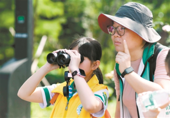 小记者用望远镜观鸟。广州日报全媒体记者邱伟荣 实习生李懿慧摄