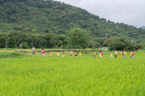 走出室内的文化馆,穿过“希望之翼”,步入“时光之门”,万顷的稻浪涌起绿波,笔直的木栈道通向远方。小记者们跟随着讲解员的脚步,深入稻田中,亲身体验插秧等农业活动。他们鼓足勇气,脱下鞋袜、挽起裤腿,一个接着一个踏入稻田中央,在工作人员的指导下,将秧苗整整齐齐地插入了水田之中。穿行于田间的孩子,就像他们刚刚插下的秧苗一般,生机郁郁。小记者骆晓萱认为,这是一次难得的户外活动:“平时,爸爸妈妈只是周末带我去爬山,这是我第一次体验插秧。”看着孩子被汗水打湿的脸庞,小记者伍荣轩的母亲也表示:“平时在城市里,没有机会带孩子来体验农活,我觉得这样的活动很有意义。”