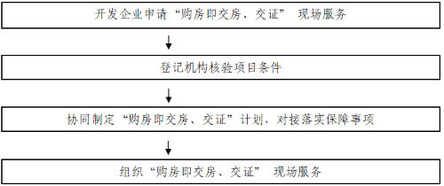 “购房即交房、交证”现场服务,采取专项申请、专人对接、有序开展的模式,即市、区不动产登记机构“企业服务专窗”受理开发企业相关申请,指引开发企业与“购房即交房、交证”现场服务专人对接。经对接确认申请项目符合“购房即交房、交证”相关范围和条件后,登记机构、税务部门协同开发企业制定“购房即交房、交证”现场服务计划,落实相关保障,指导完成增量房转移登记、预告抵押转持证抵押登记网上申请,共同提供“购房即交房、交证”现场服务。