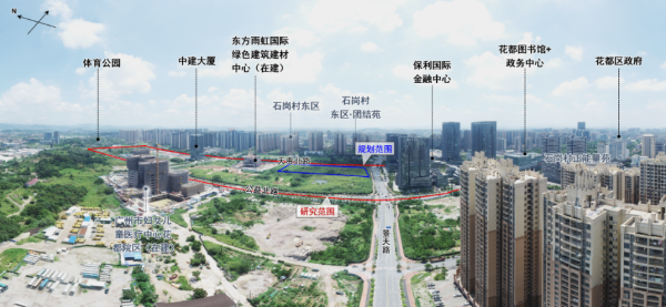 该项目位于花都区城市公共空间主轴与花都大道发展轴交汇的核心区域,总用地面积约2.2公顷。南邻保利国际金融中心、花都图书馆与区政务服务中心,北接在建东方雨虹总部,东西两侧为待招商空地及石岗村留用地,距花都区政府仅约1公里,区位条件优越,是花都塑造城市中心标志性天际线、提升空间形象的重要支点。