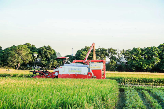 隆平稻香园秋收图景:收割机作业于青绿与金黄交织的稻野