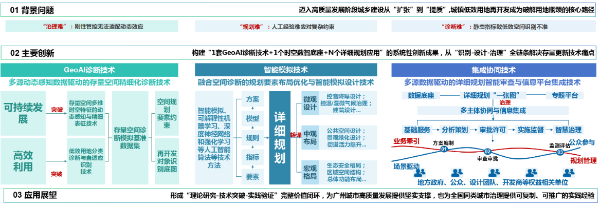 本项目面向国土空间治理现代化与土地要素市场化改革深化需求,针对城镇低效用地再开发中传统规划“诊断难、规划难、治理难”的瓶颈,系统构建“诊断-模拟-治理”全流程技术体系。通过多源动态感知数据的GeoAI模型,实现微观尺度存量精细化识别、自适应智能诊断;首创“诊断指标-规划参数-设计标准”智能转译与多智能体模拟优化,支撑规划方案自动生成与比选;构建了“规则+数智底座+应用”协同治理平台,研发GeoAI智能审查引擎,实现全链条协同治理。成果已形成专著、专利等系列知识产权,应用于广州、深圳多地,精准识别低效用地、提升规划管理效率约20%,助力低效用地增值超百亿元,为存量空间精细化治理提供了可复制、高效能的解决方案。