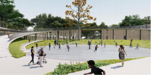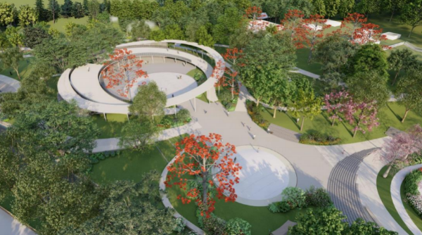 项目秉持“保护优先、自然共生”理念,尊重场地原貌与生态肌理,以“圆满”为设计核心,用圆形建筑语言呼应花桥弧线,围合场地内珍稀树木,营造“人、树、檐下”的岭南特色场所。建筑采用轻盈通透的现代岭南风格,与周边环境协调,成为自然延伸的“地景建筑”。核心区规划戏水广场、下沉式剧场与旱喷设施,搭配草坪叠级坐凳,兼具游玩与休憩功能;驿站主体融合科普展示与便民服务,屋顶与首层贯通,将成为观赏园景与城景的独特平台。