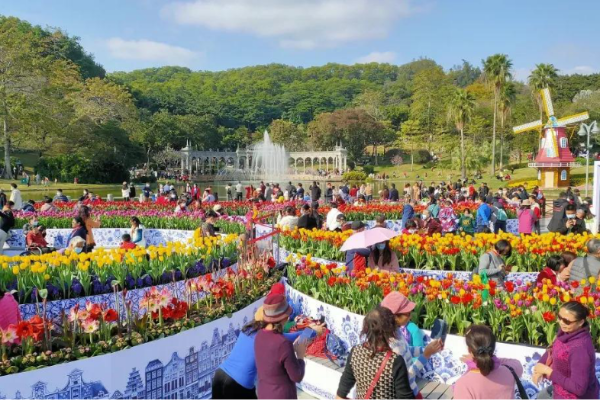 云台花园背依云台岭,是一座集东、西方园林艺术于一体的大型花园。每年春节期间,这里都会举办主题花展,将数万株郁金香与欧式建筑完美融合,成为广州新春必打卡的赏花胜地。