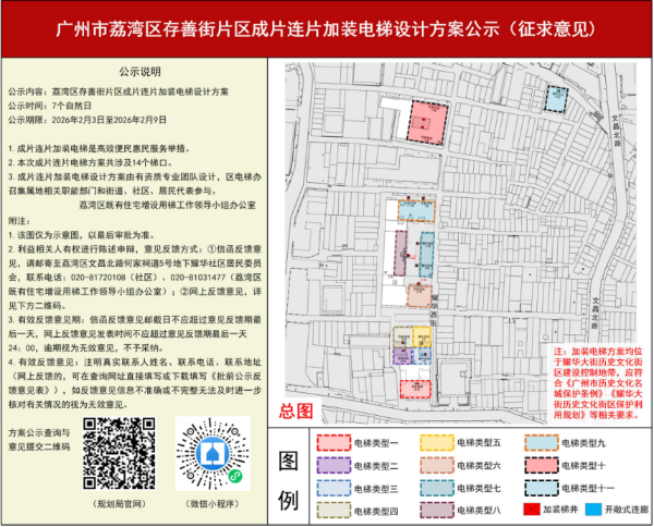 老城新生,民心所向。2月9日,广州市荔湾区存善街片区成片连片加装电梯设计方案完成批前公示。覆盖14个梯口,惠及多个老旧住宅楼栋居民,不仅有效改善了老街坊们的出行条件、提升了居住品质,更是我市在严格保护街区风貌前提下,探索民生改善与历史文化街区风貌保护协同共进的生动典范,为全市同类街区的更新工作提供了宝贵的“荔湾经验”。