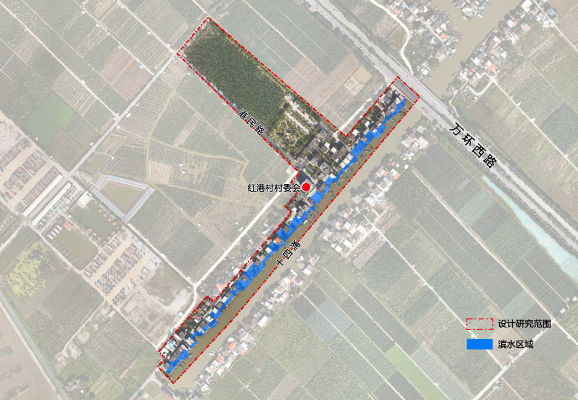 万顷沙镇红港村村落沿十四涌两岸景观带全长约700m,村落面积约39公顷。涉及渔家小院滨水区域占地面积约8050平方米,以雨棚、围栏、花园、码头及停船杆等特色元素构成。