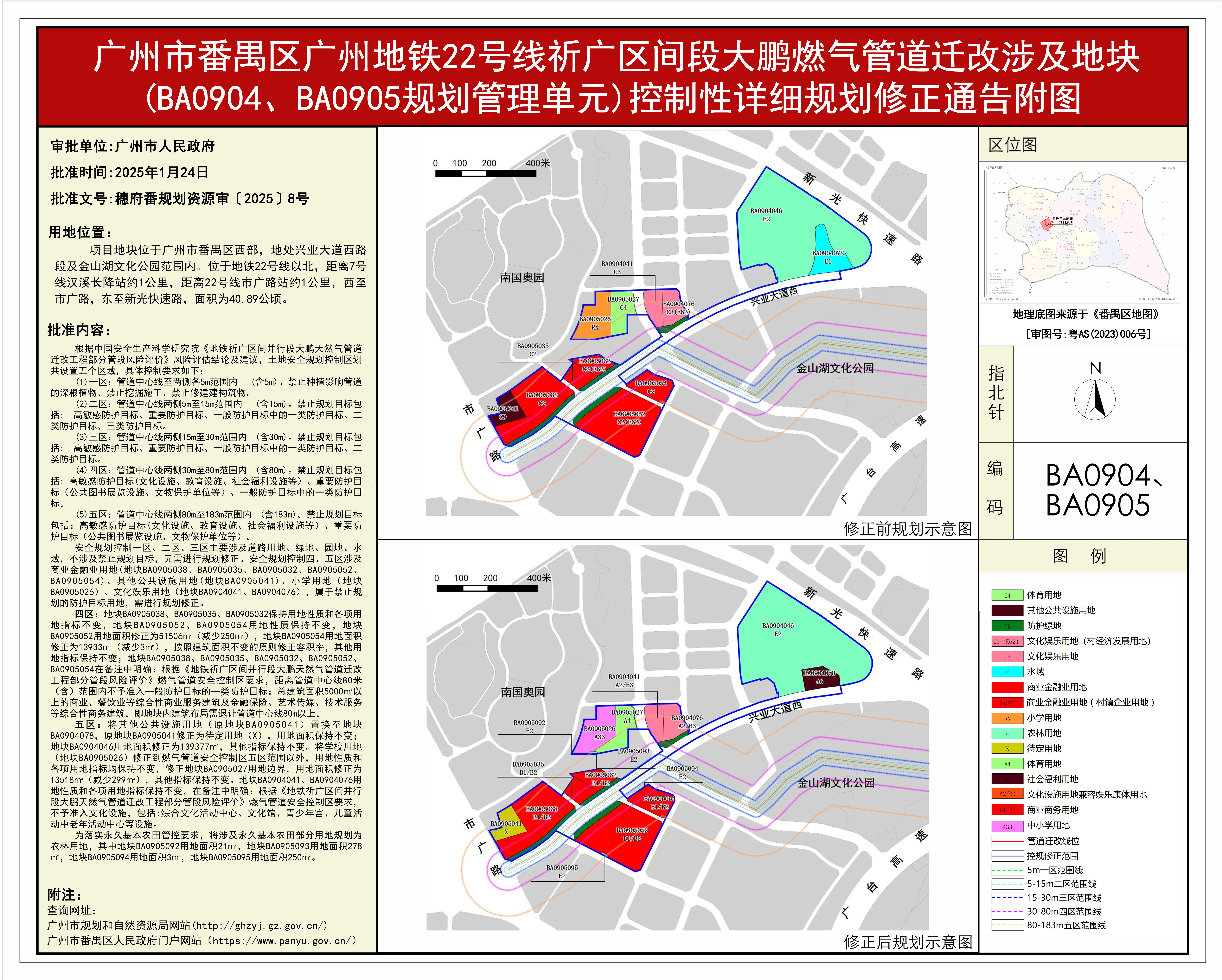 根据《广东省城市控制性详细规划管理条例》,《广州地铁22号线祈广区间段大鹏燃气管道迁改涉及地块(BA0904、BA0905规划管理单元)控制性详细规划修正》规划成果已完成规划技术审查、批前公示、征询相关单位意见等程序,并经番禺区土地和规划领导小组会议审议通过后获广州市人民政府批准(穗府番规划资源审[2025]8号),自批准之日(2025年1月24日)起生效。