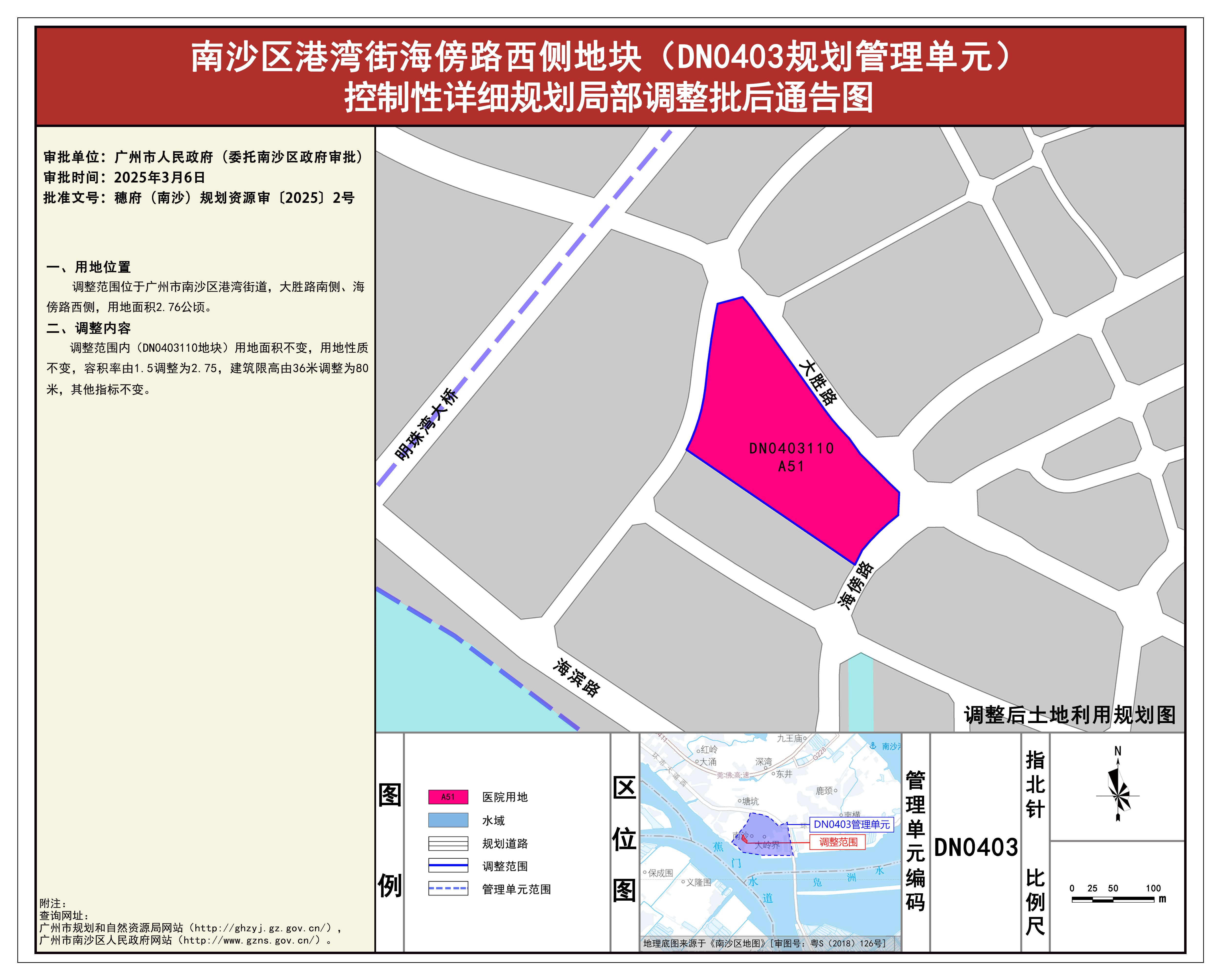 根据《广东省城市控制性详细规划管理条例》《广州市城乡规划程序规定》有关规定,《南沙区港湾街海傍路西侧地块(DN0403规划管理单元)控制性详细规划局部调整》已完成规划技术审查、批前公示等程序,并经广州市南沙新区自然资源规划与利用委员会审议通过后,获广州市人民政府(委托广州市南沙区人民政府)批准(穗府(南沙)规划资源审〔2025〕2号),自批准之日(2025年3月6日)起生效。