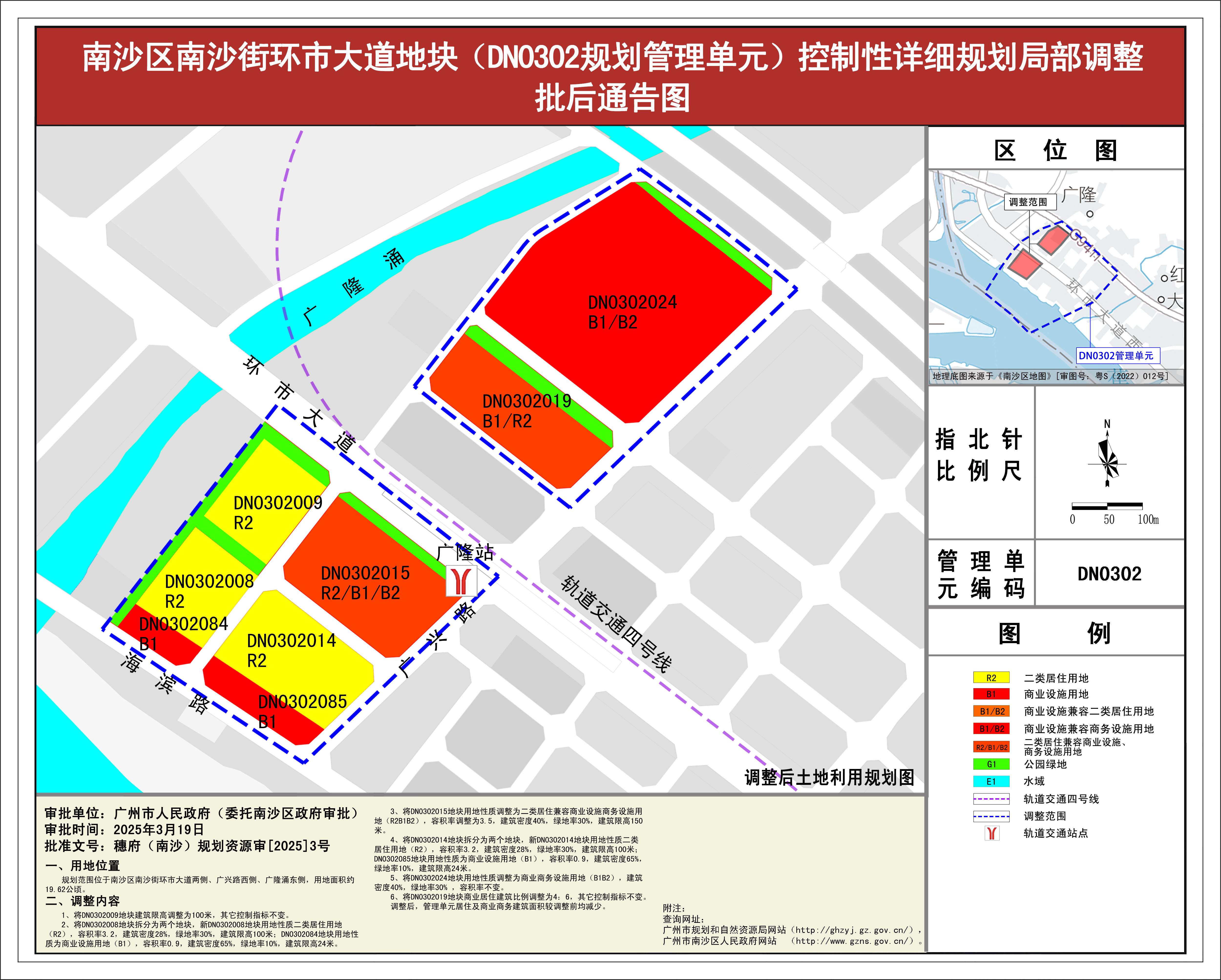 根据《广东省城市控制性详细规划管理条例》《广州市城乡规划程序规定》有关规定,《南沙区南沙街环市大道地块(DN0302规划管理单元)控制性详细规划局部调整》已完成规划技术审查、批前公示等程序,并经第一届广州市南沙新区自然资源规划与利用委员会审议通过后,获广州市人民政府(委托广州市南沙区人民政府)批准(穗府(南沙)规划资源审〔2025〕3号),自批准之日(2025年3月19日)起生效。