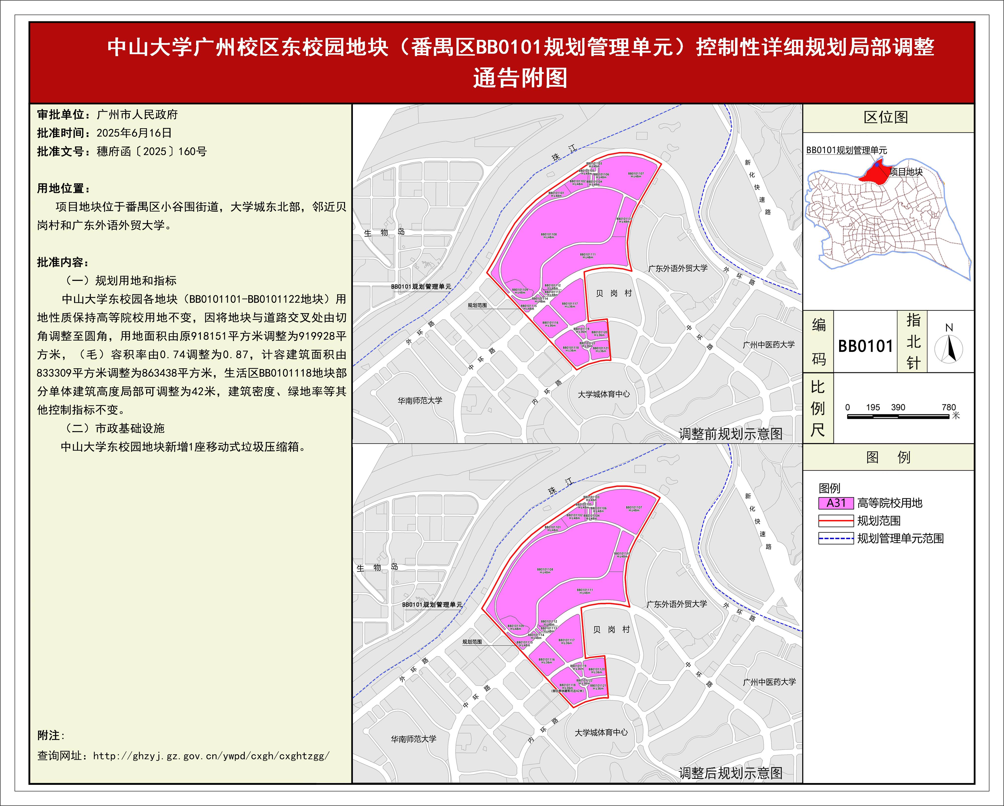 根据《广东省城市控制性详细规划管理条例》,《番禺区六涌河以北地块(BD0501规划管理单元)控制性详细规划局部调整》《中山大学广州校区东校园地块(番禺区BB0101规划管理单元)控制性详细规划局部调整》2项规划成果已完成编制、审查、公示等程序,由广州市规划委员会审议通过后经广州市人民政府批准(穗府函〔2025〕160号),自批准之日(2025年6月16日)起生效。